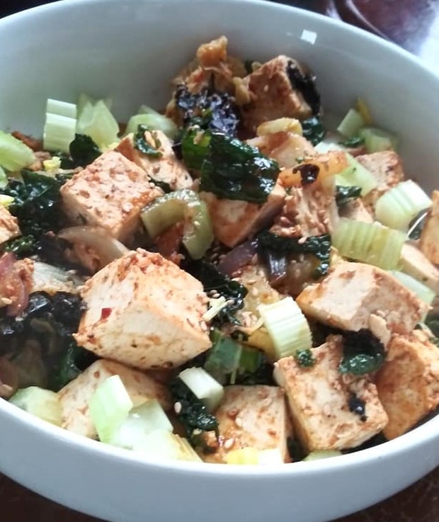 A vibrant bowl of spicy tofu stir-fry with celery and greens, showcasing a healthy and flavorful dish.A colorful chickpea salad topped with fresh vegetables.A delicious bowl of tofu with tomatoes in a rich sauce served over quinoa.Oat cereal with fresh fruit, dried bananas, seeds, chocolate, and almond milkChickpea salad spread over toasted sprouted sesame seed breadColorful vegetable and fruit skewers served outdoors at an outdoor picnic